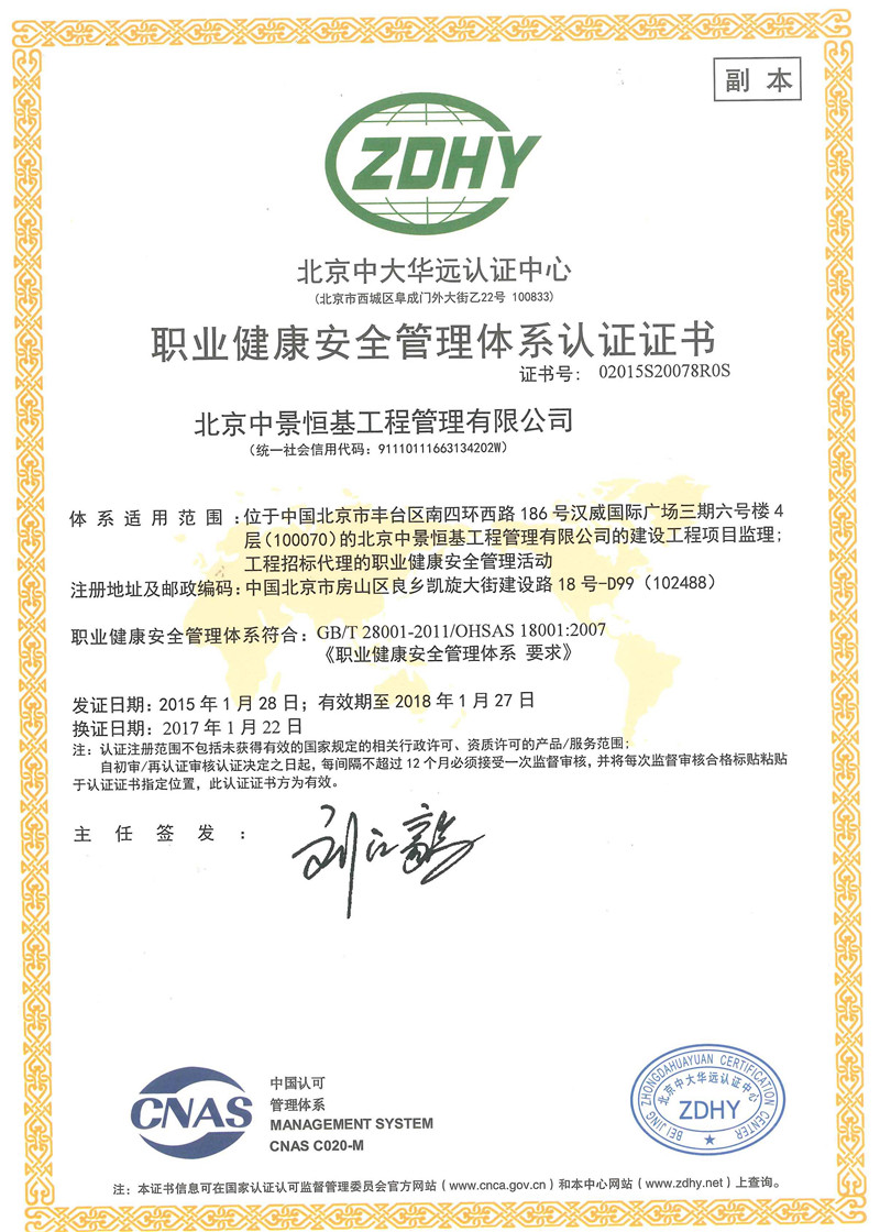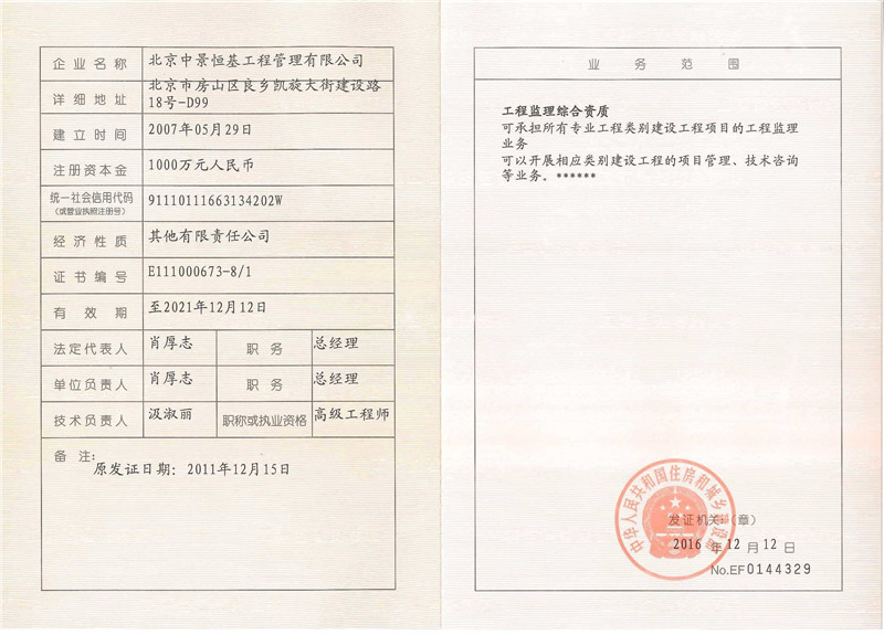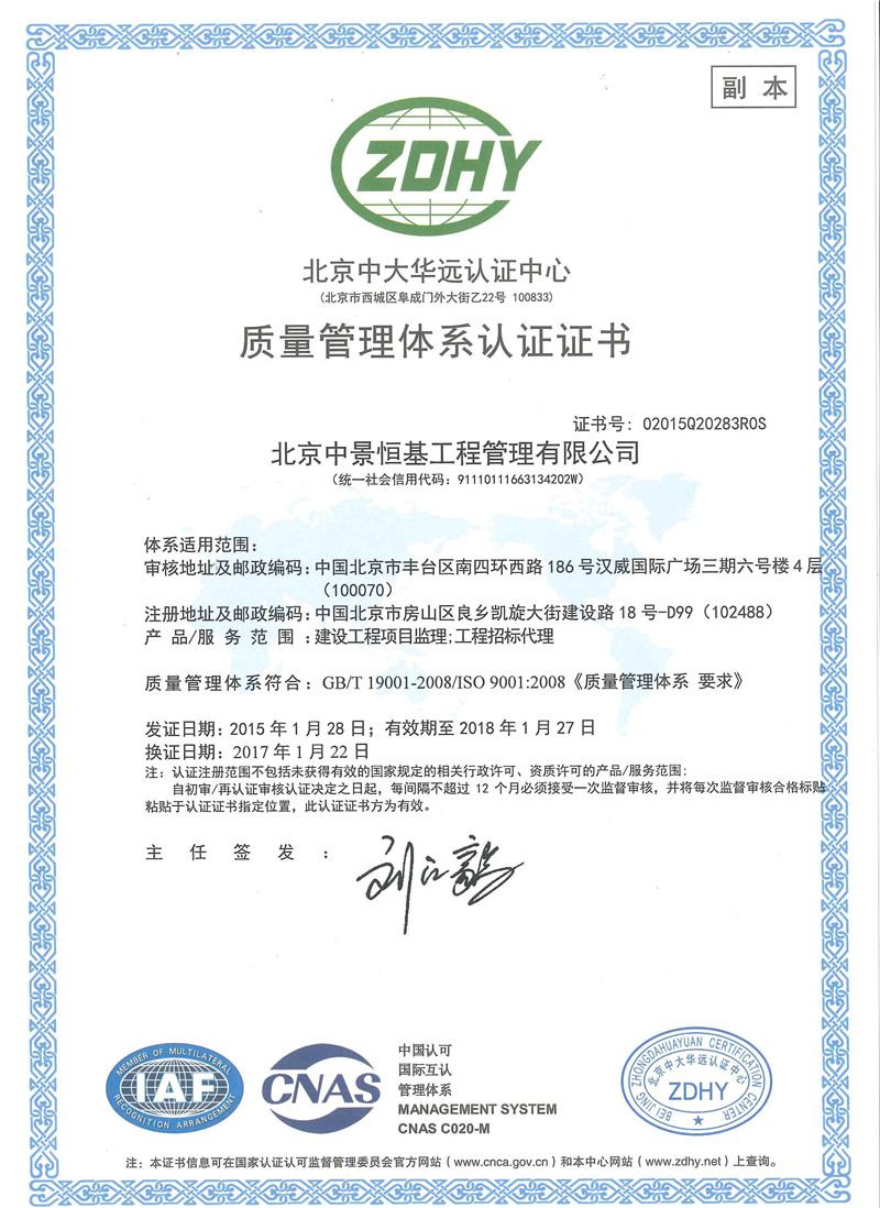 北京中景恒基工程管理有限公司(以下簡稱“公司”) 具有工程監(jiān)理綜合資質(zhì)、造價咨詢甲級資質(zhì)、水利工程、人防工程監(jiān)理資質(zhì)和工程招標代理資質(zhì),是全國百強監(jiān)理企業(yè)之一。主要從事工程監(jiān)理、造價咨詢、項目管理、招標代理等咨詢服務 業(yè)務。 公司自成立以來,始終注重自身建設,強化內(nèi)部管理,形成了一套標準化、信息化、科學化的管理模式。率先通過了ISO9001質(zhì)量管理體系、IS...